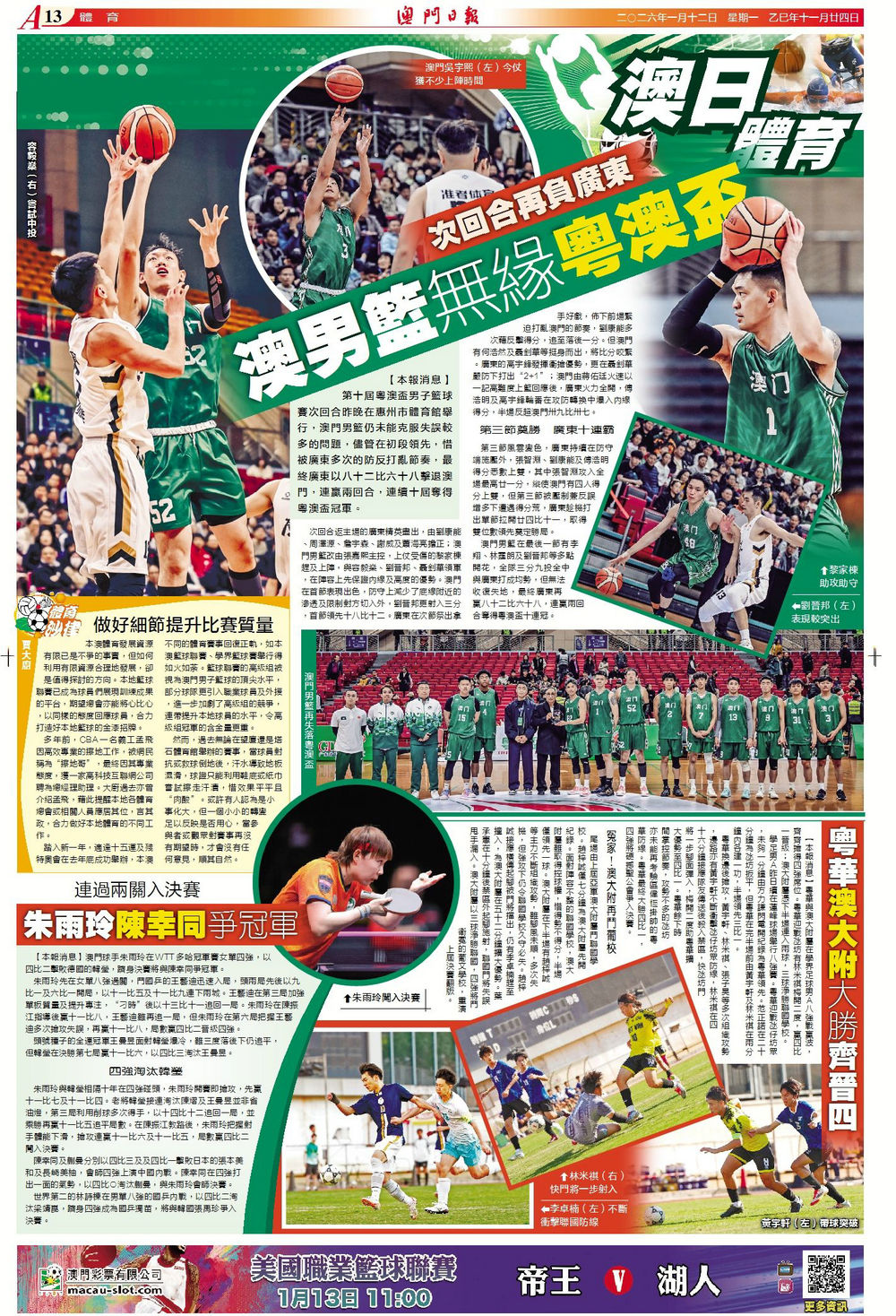 澳男籃無緣粵澳盃 粵華澳大附大勝齊晉四 做好細節提升比賽質量 朱雨玲陳幸同爭冠軍
