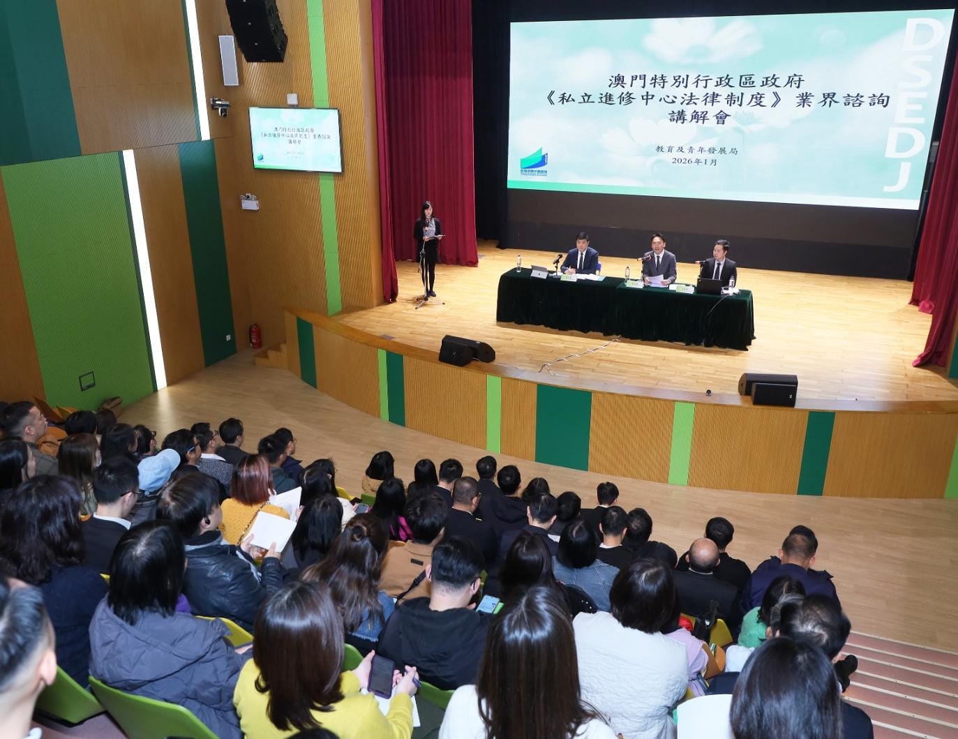 為確保《私立進修中心的法律制度》法案的修訂能達至符合社會發展所需,教青局開展業界諮詢,諮詢期為本月6日至20日,期間共舉辦四場業界諮詢講解會,向業界代表詳細介紹法案內容,聆聽及收集業界對法案的意見及建議。首場講解會於今天舉行,由教青局長龔志明及相關主管人員詳細說明法案的各項要點,包括適用範圍、營運要件、人員的適當資格、監管措施,以及電子服務優化申請流程等方面;多名業界代表隨即發表意見,提出各項不同的意見及建議。教青局將繼續收集業界的建議,以完善《私立進修中心的法律制度》草案,促進澳門私立教育體系健康、有序及可持續發展。