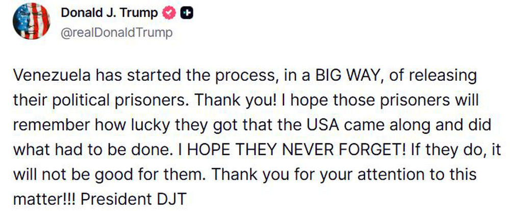 【澳門日報消息】委內瑞拉人民政權監獄服務部12日通報稱,過去數小時內共批准116宗新的釋放決定,包含因涉及擾亂憲法秩序、危害國家穩定相關事件而被剝奪自由的人員。 委內瑞拉全國代表大會主席豪爾赫·羅德里格斯8日表示,委內瑞拉政府決定馬上釋放“大量”外國和本國籍囚犯,以展示“和平姿態”。隨後,有囚犯家屬聚集在一處監獄門口,等待獲釋消息。 美國總統特朗普11日在社交平台發文,稱是“美國及時介入並採取必要的行動”促成此事。