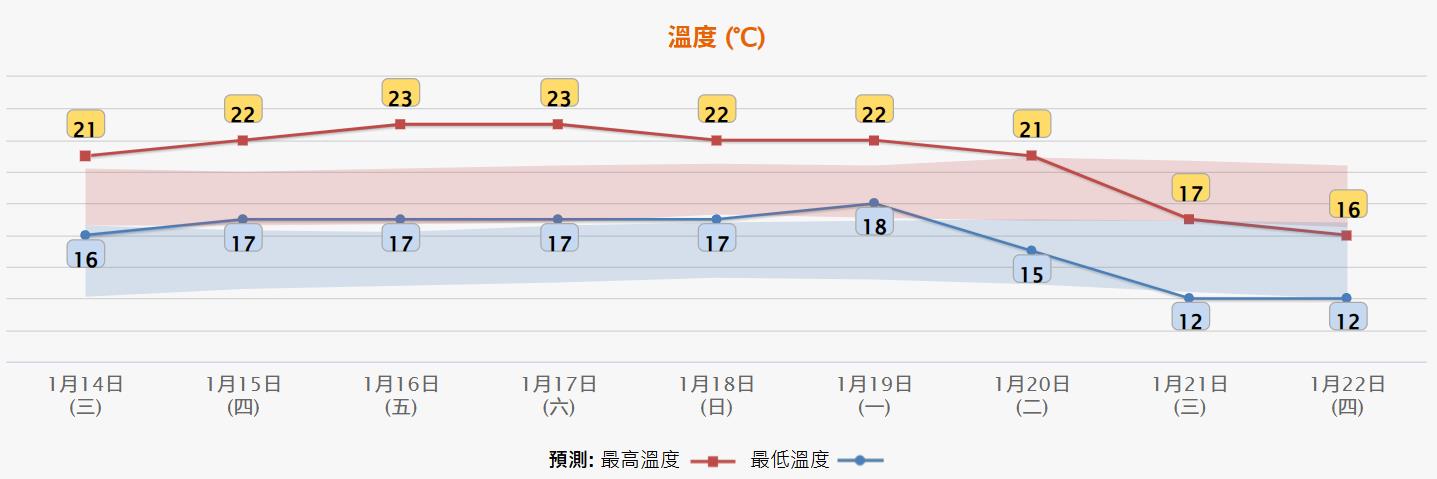 天氣預報顯示,下周二氣溫將下降,最低15度;下周三氣溫進一步下降,屆時最低僅12度;下周四持續寒冷,最低溫同樣只有12度。