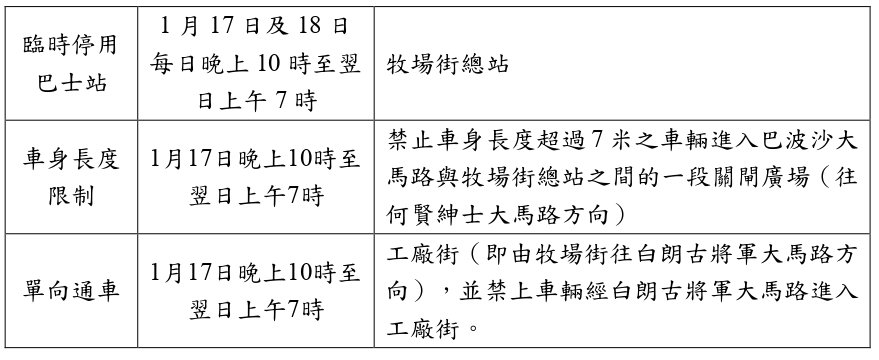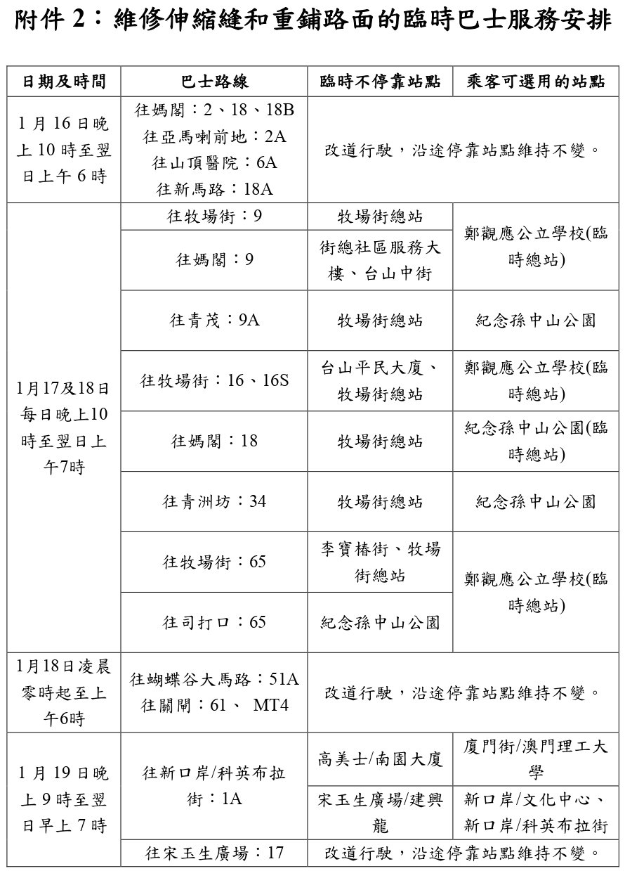 【澳門日報消息】配合市政署維修伸縮縫和重鋪路面,宋玉生廣場、新雅馬路和關閘廣場的行車天橋,以及關閘廣場一帶道路1月15日至20日分階段實施臨時交管。 巴士服務方面,為配合工程,多條巴士路線改道行駛或調整停靠站點,詳情可查閱下圖或兩巴網頁(澳巴網頁、新福利網頁)。