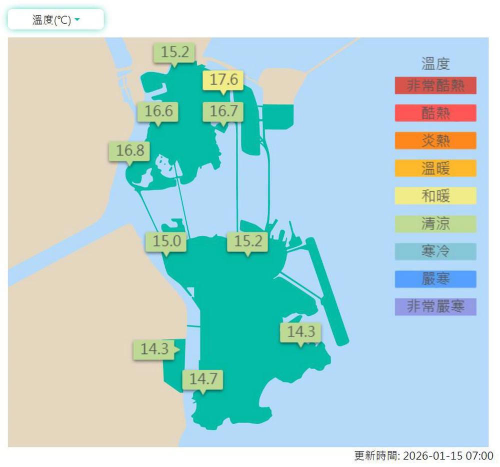 【澳門日報消息】一股東北季風正影響本澳天氣。今日大致天晴,吹2至3級東至東北風,氣溫攝氏15至22度。相對濕度介乎百分之40至90之間,預測最高紫外線指數約為6,級別屬於高。 明日天晴,部分時間多雲,吹2至3級東至東北風,氣溫攝氏15至23度,相對濕度介乎百分之55至95之間。